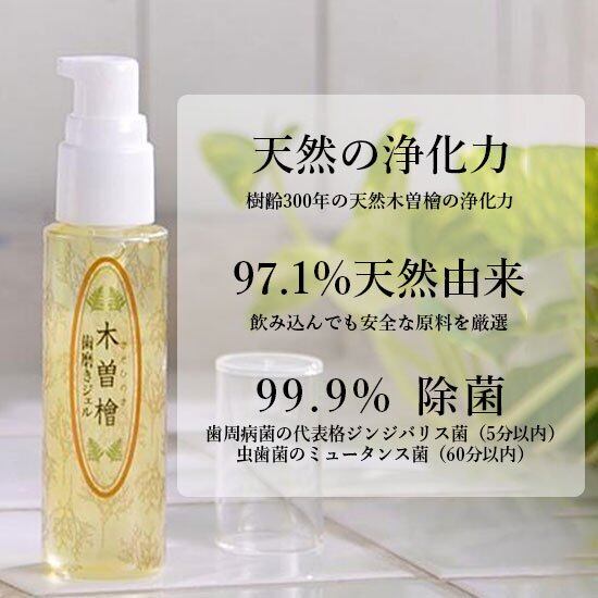 また、いわゆる虫歯菌と呼ばれるミュータンス菌も、60分以内に99.9%除菌します。この天然のヒノキの水をたっぷりと、原材料の75%も使っているのが木曽檜歯磨きジェル。歯周病菌への効果を証明できる世界で唯一の歯磨き剤なのです。