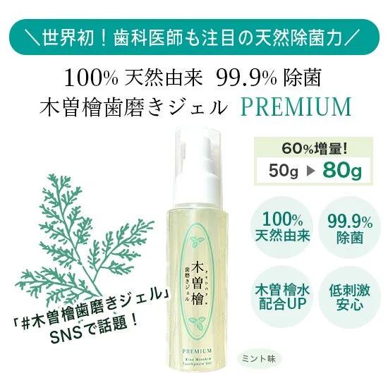 また、いわゆる虫歯菌と呼ばれるミュータンス菌も、60分以内に99.9%除菌します。この天然のヒノキの水をたっぷりと、原材料の82%も使っているのが木曽檜歯磨きジェル。歯周病菌への効果を証明できる世界で唯一の歯磨き剤なのです。